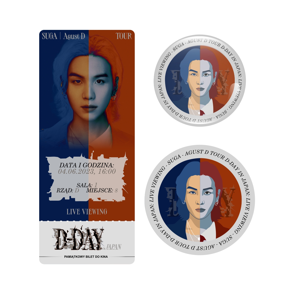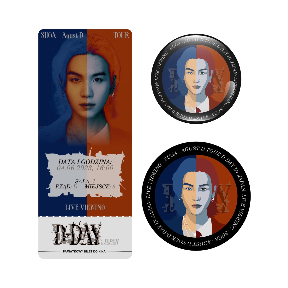 Zestaw perłowa przypinka i naklejka SUGA - AGUST D TOUR D-DAY IN JAPAN (wersja 1) + BILET GRATIS!