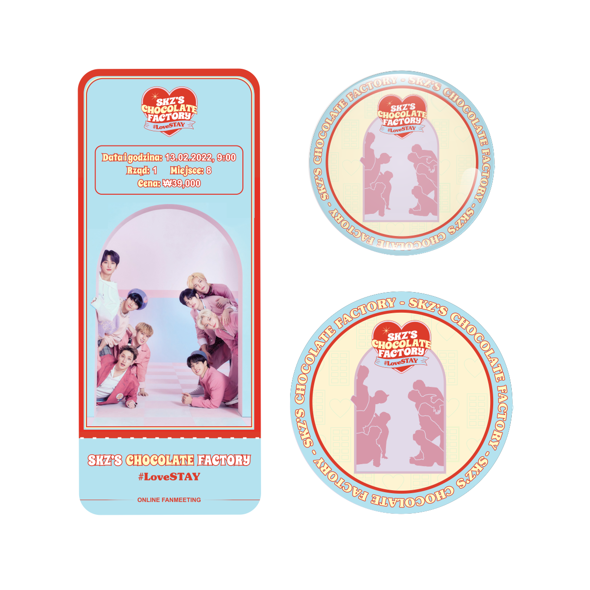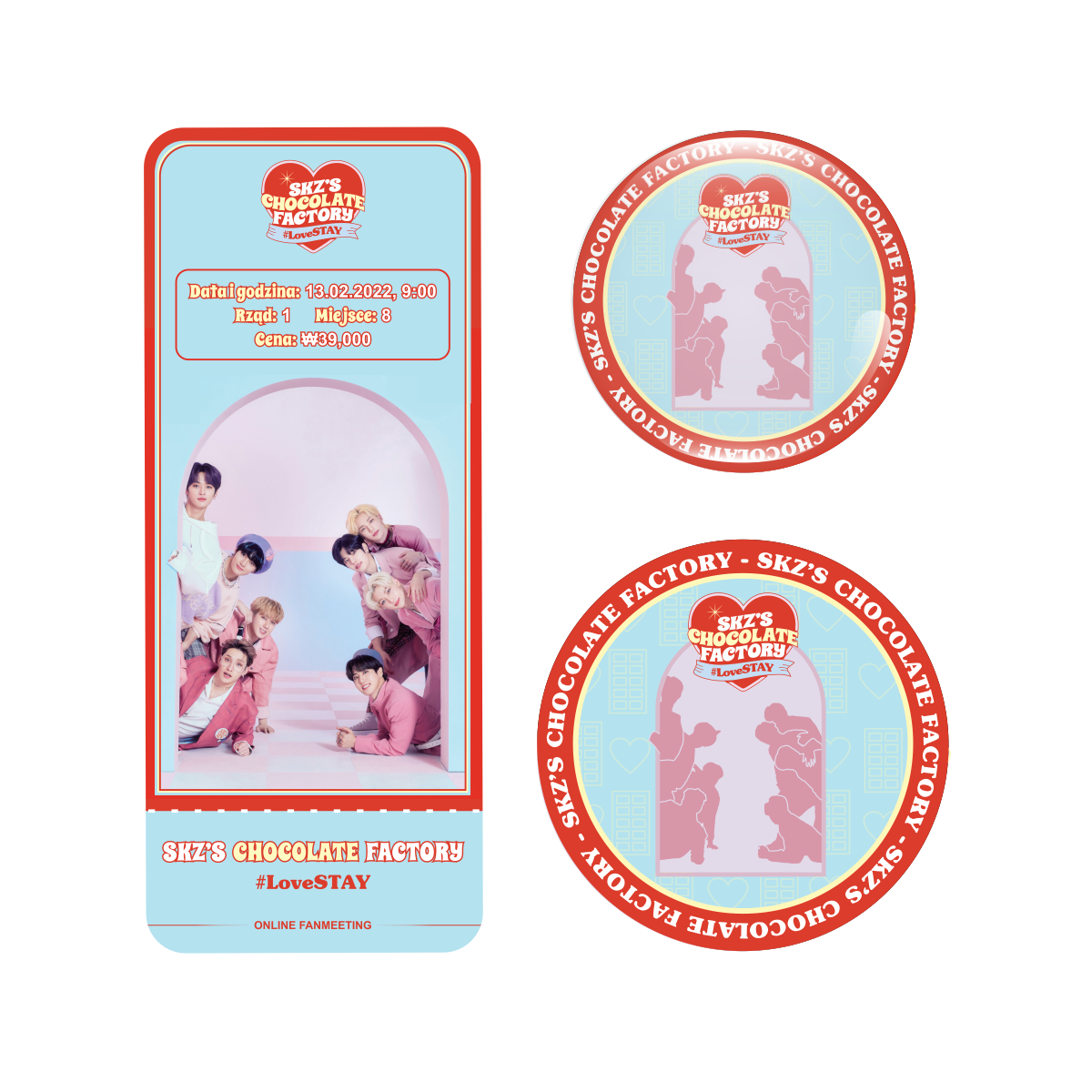 Zestaw perłowa przypinka i naklejka SKZ'S CHOCOLATE FACTORY (wersja 2) + BILET GRATIS!
