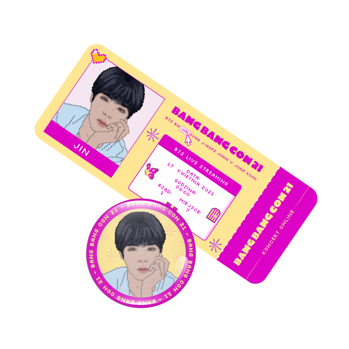 Perłowa przypinka BTS BANG BANG CON 21 (wersja Jin) + BILET GRATIS!