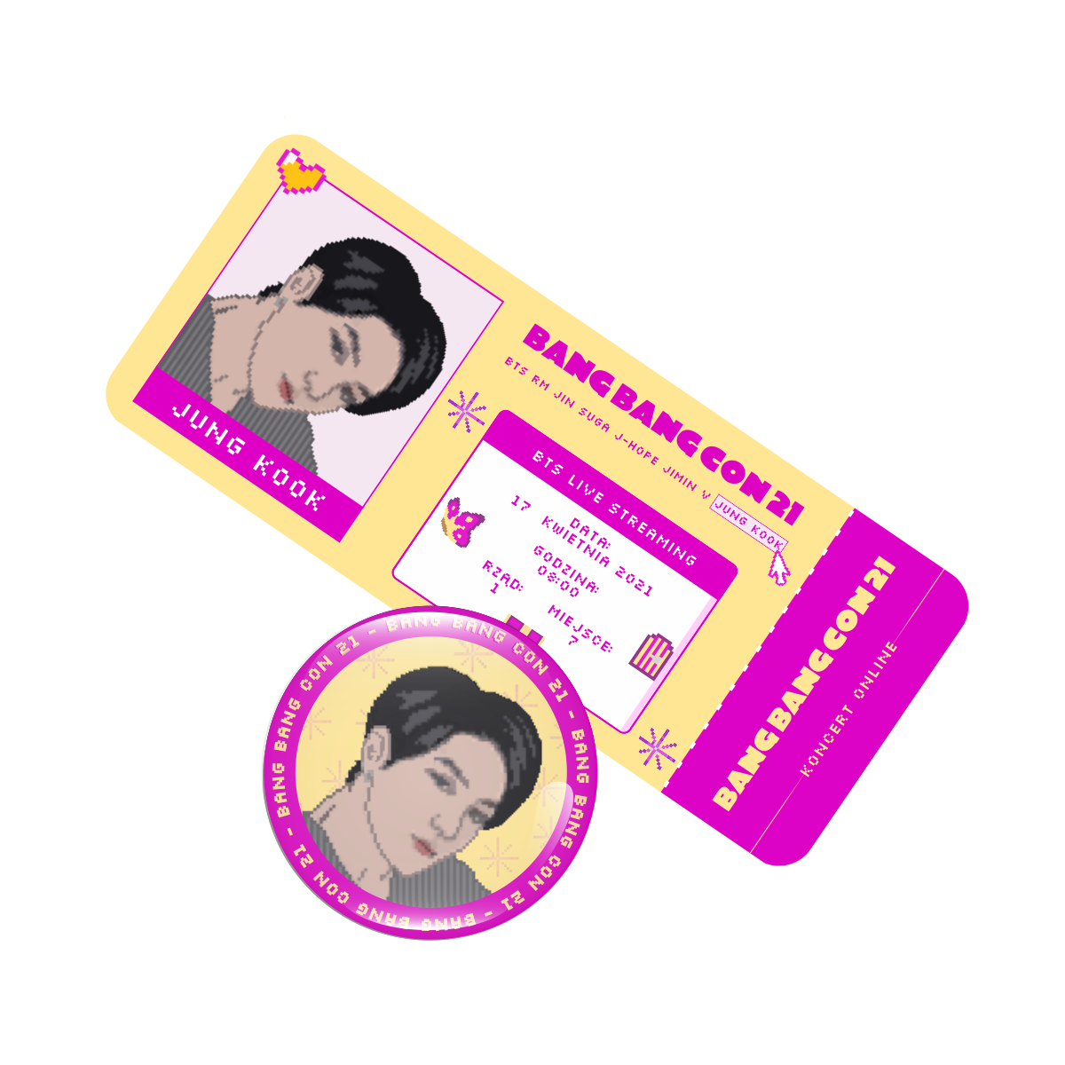 Perłowa przypinka BTS BANG BANG CON 21 (wersja Jung Kook) + BILET GRATIS!