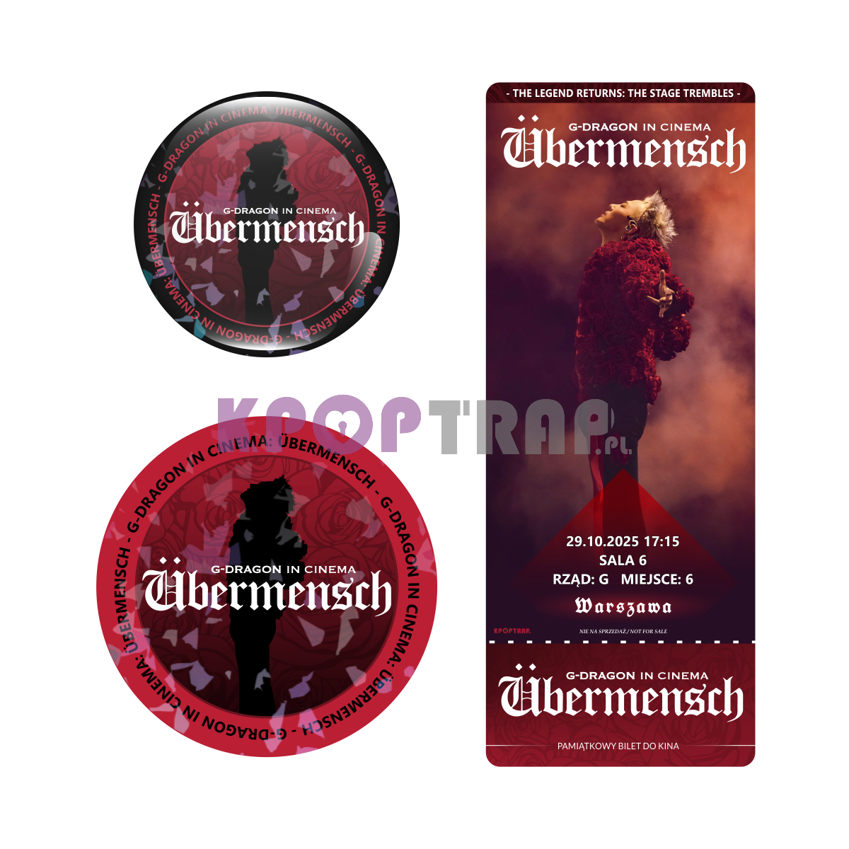 Wyjątkowy zestaw z przypinką i naklejką holograficzną dla wszystkich miłośników twórczości G-DRAGONA! Upamiętnijmy razem wyjątkowy pokaz koncertu G-Dragon In Cinema: Ubermensch!